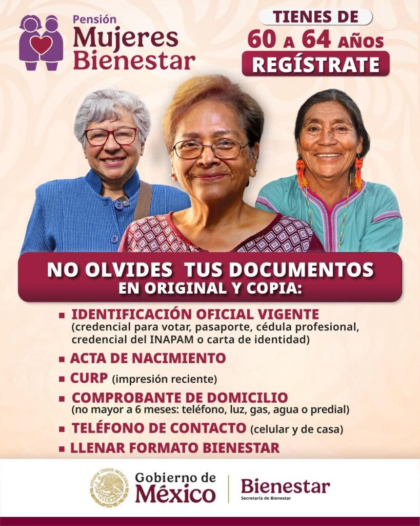 Del 1 al 30 de agosto será el registro a la Pensión Mujeres Bienestar de 60 a 64 años