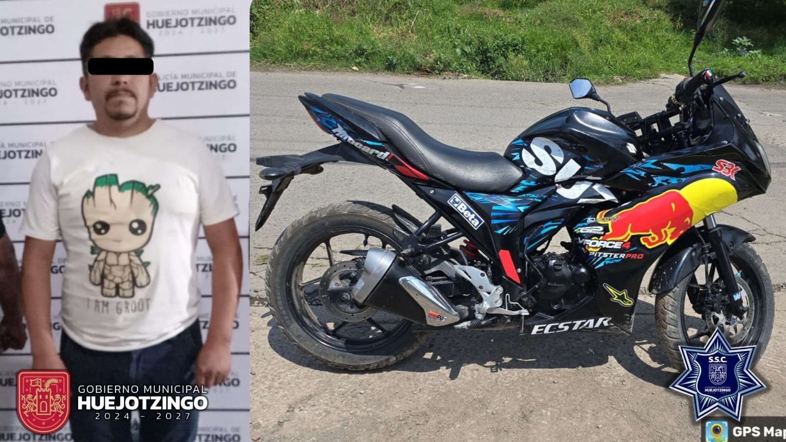 En la Junta Auxiliar de Santa Ana Xalmimilulco, en la Calle Real de la Posta, se detuvo a Israel N., de 39 años, quien conducía una motocicleta Suzuki 150F, modelo 2017, sin placa. La verificación en el REPUVE confirmó un reporte de robo, por lo que el vehículo y el detenido fueron puestos a disposición del Ministerio Público.