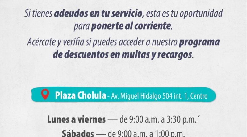 El Sistema Operador de los Servicios de Agua Potable y Alcantarillado de San Pedro Cholula (SOSAPACH) informa a la ciudadanía que se encuentra vigente el programa “Pon tu cuenta al corriente”, una alternativa para que los usuarios regularicen su servicio de agua potable.