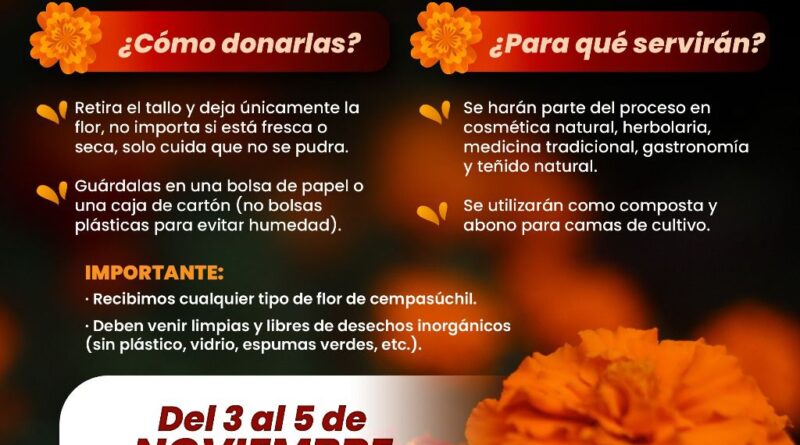 Para donar sus flores, se deberá: retira el tallo, deja solo la flor (puede estar seca, pero no podrida); guárdalas en una bolsa de papel o caja de cartón; entrega tus flores limpias y libres de desechos inorgánicos (sin plástico, vidrio, espuma floral, etc.); se recibe cualquier tipo de flor de cempasúchil.