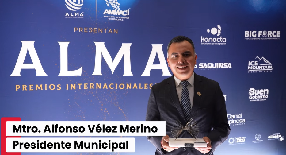 Recibe reconocimiento por su gran trabajo en beneficio de los grupos vulnerables y por impulsar proyectos innovadores con impacto intermunicipal, el presidente municipal de Los Reyes de Juárez, Alfonso Vélez Merino, por parte de la Asociación de Municipios de México (AMMAC) durante el evento ALMA.