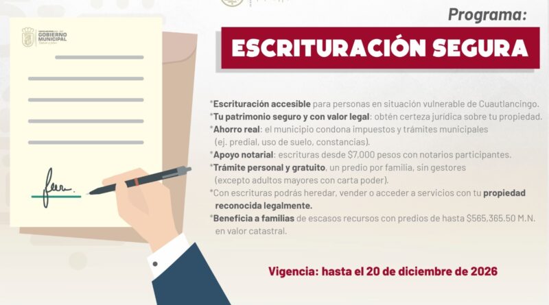 Cuautlancingo, Pue.- Con el objetivo de brindar certeza jurídica al patrimonio de las familias, el Gobierno municipal de Cuautlancingo, a través de la Sindicatura Municipal, mantiene vigente el programa “Escrituración Segura”, dirigido a ciudadanos de escasos recursos que requieran regularizar la situación legal de sus bienes inmuebles.